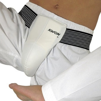 Bredt elastiskbånd i livet holder skridtbeskytteren på plads. Hård plastikkop, dækket med vinyl. Testet for skadelige stoffer.