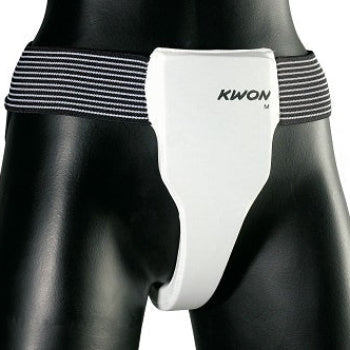 Bredt elastiskbånd i livet holder skridtbeskytteren på plads. Hård plastikkop, dækket med vinyl. Testet for skadelige stoffer.